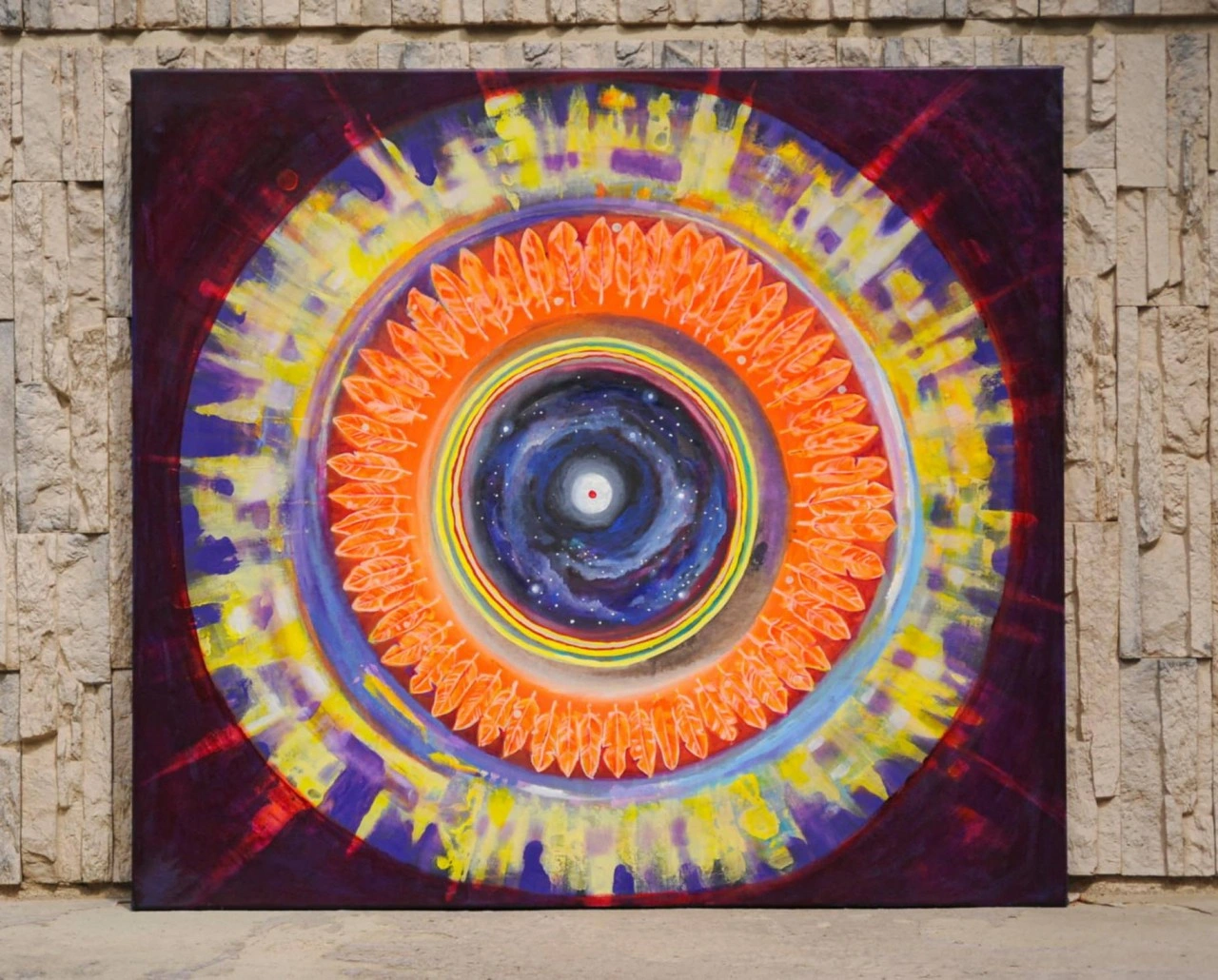„Galaktyczne Przebudzenie” Mandala wszechświata i duszy. Energia koloru, światła i wewnętrznej ciszy. To podróż w głąb siebie – tam, gdzie zaczyna się kosmos. Wymiar: 100 x 90 cm akryl na płótnie
