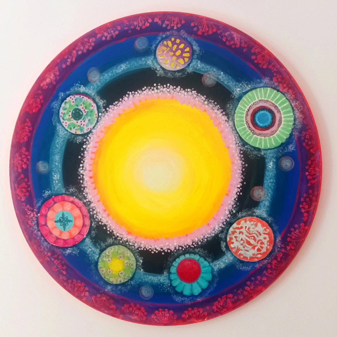 „Rodzinny Układ Słoneczny” Obraz intencyjny pt „Rodzinny Układ Słoneczny” dla Małgosi Powstał z głębokiej potrzeby uchwycenia duchowej więzi łączącej rodzinę. Średnica 80 cm akryl na płótnie