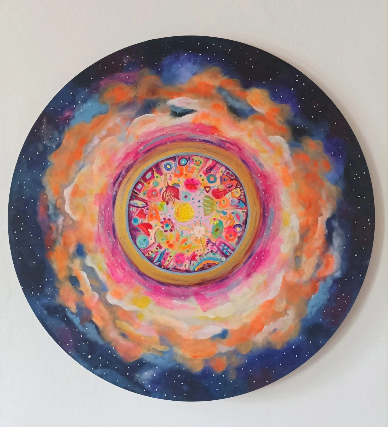 To przestrzeń, która pulsuje, jakby Wszechświat przez chwilę przypomniał sobie o nas i wciągnął nas do środka swojego snu, do zabawy. W środku rytm życia, kolory emocji, drobne znaki, które pojawiają się, gdy pozwolimy, by ręka malowała szybciej niż myśl. Na zewnątrz - oddech, kosmiczny bezruch, granica, za którą wszystko znika w nieskończoności.Ktoś mi kiedyś napisał komentarz pod tym obrazem: