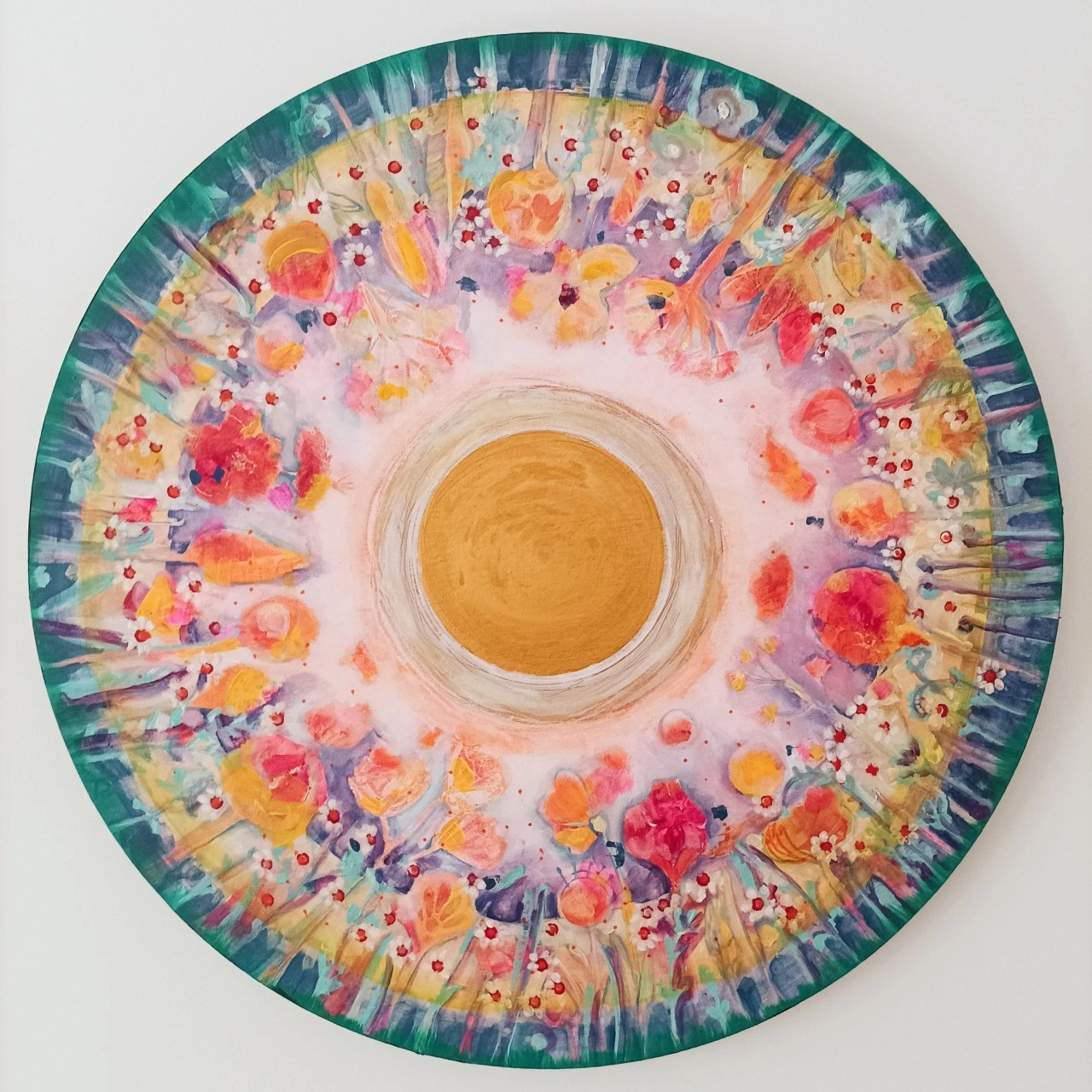 Złote centrum symbolizuje słońce, Źródło życia, wewnętrzną moc i Boskie prowadzenie. Wokół niego pulsuje krąg barw - dojrzałych owoców intencji, które zakiełkowały i rozkwitły w pełni czasu. „Żniwa” to wizualna medytacja, przypomnienie o cyklu zasiewu i zbioru, o magii manifestacji i wdzięczności. To energia końca i początku – moment, w którym zbieramy owoce swojej pracy, by zasilić nimi kolejne etapy istnienia.